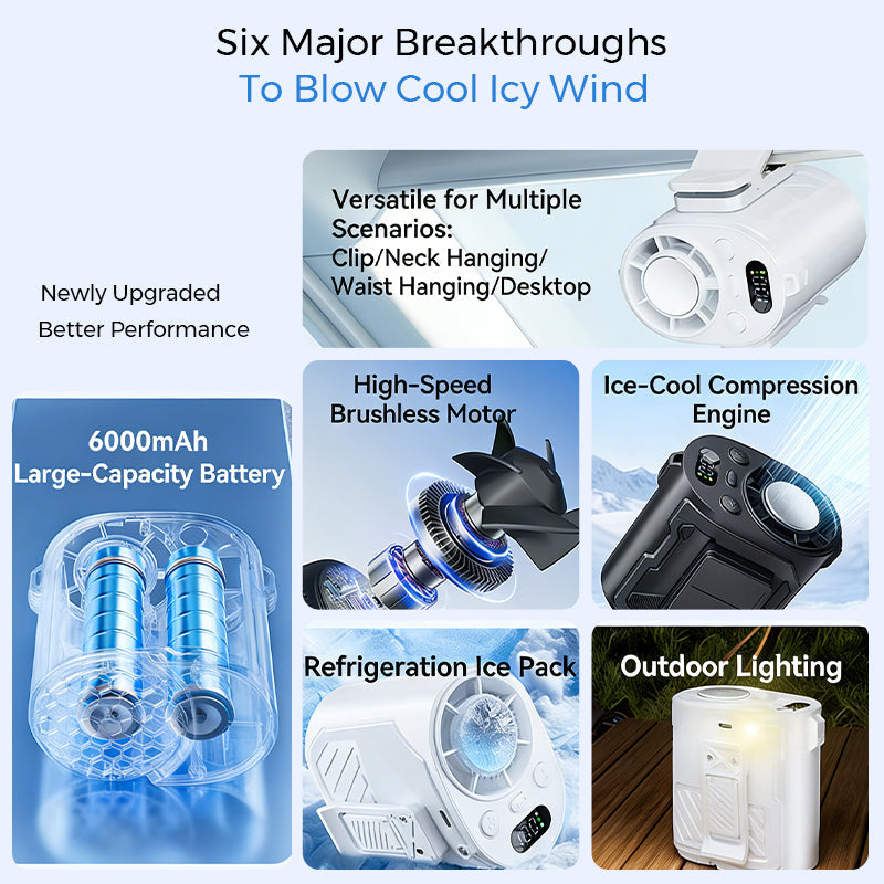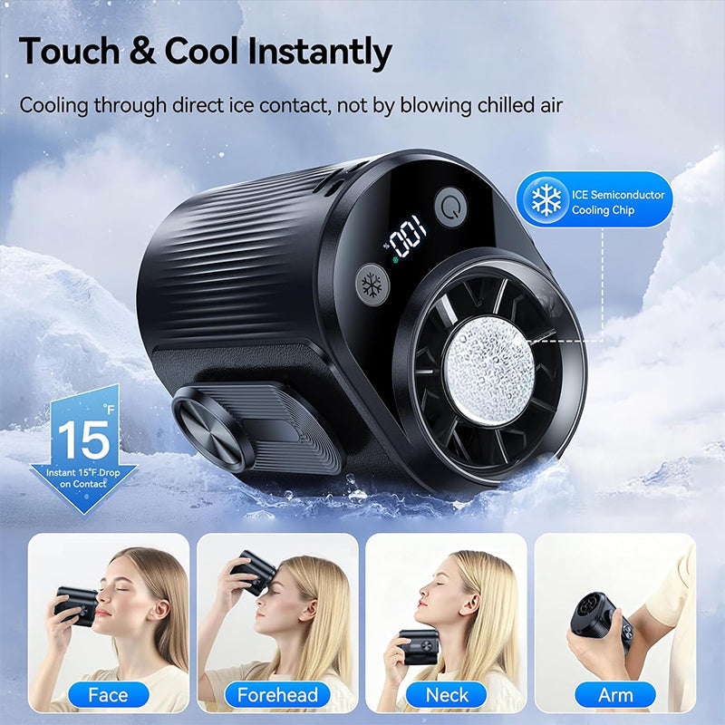 • Ice semiconductor cooling: Features a direct-skin-contact cooling plate for instant cooling effect. Note: Provides localized cooling through direct ice contact, not by blowing chilled air.