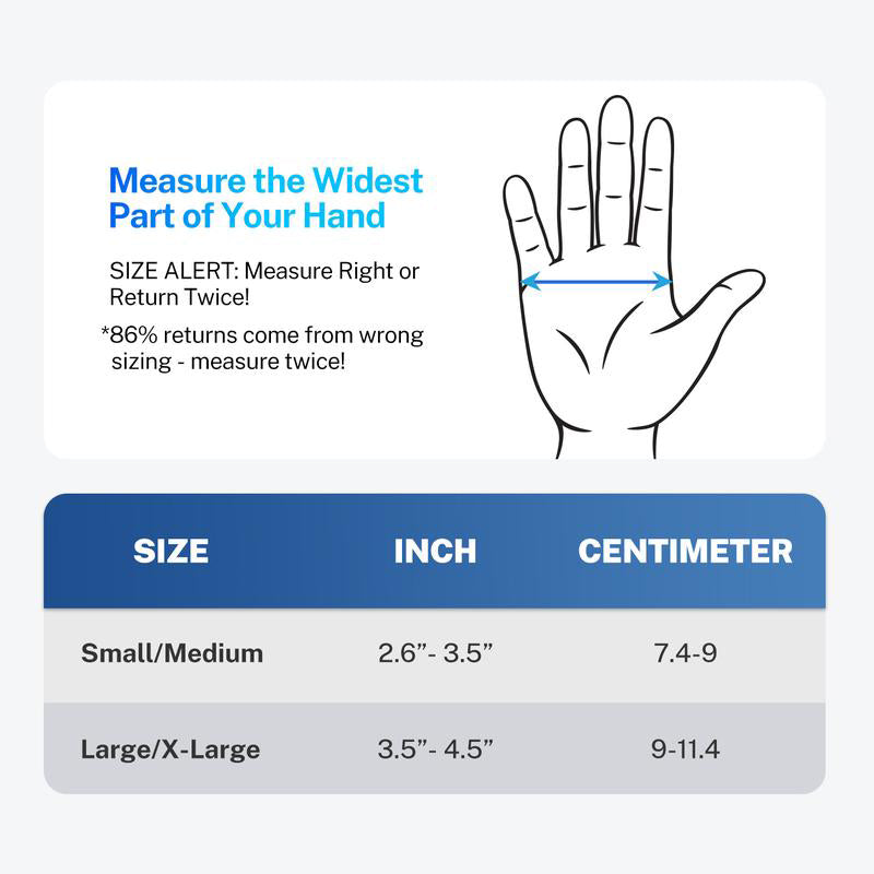 How to select correct size: Measure the widest part of your hand. Size chart: S/M (2.6"-3.5"), L/XL (3.5"-4.5"). Fit both hands.