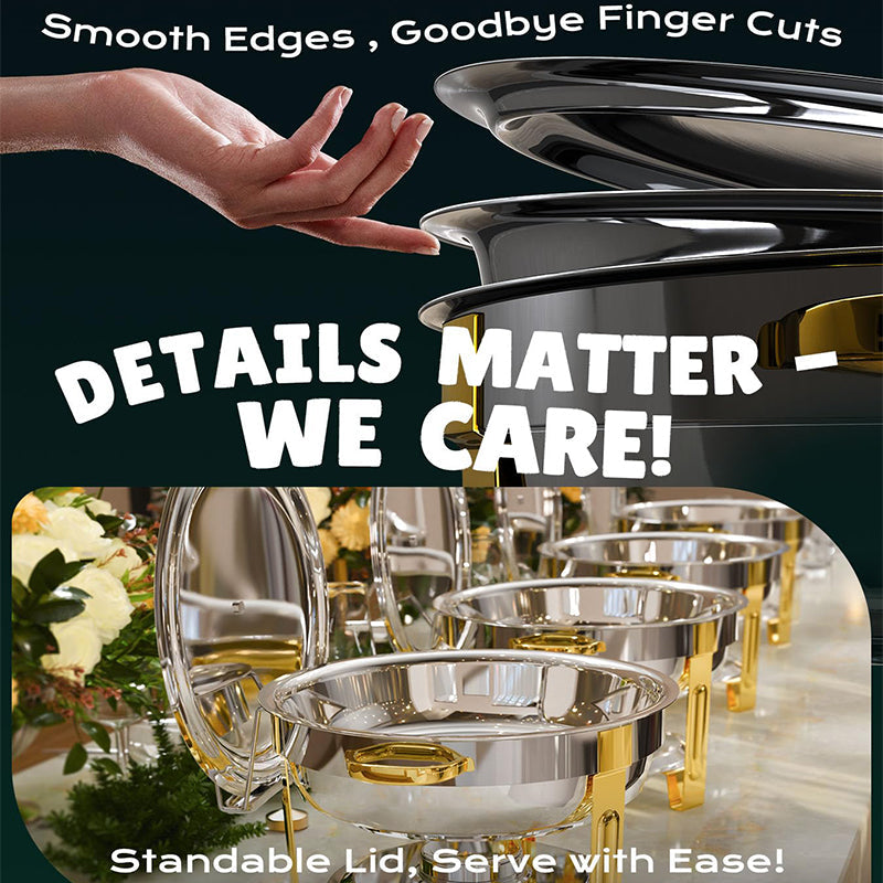- Safe design: Enjoy a safer experience with our chafing dish set, thanks to our smooth, rounded metal edges. After extensive polishing and refinement, our innovative design eliminates sharp edges and reduces the risk of cuts. Handle, arrange, and clean with confidence, knowing your set is designed for safety.