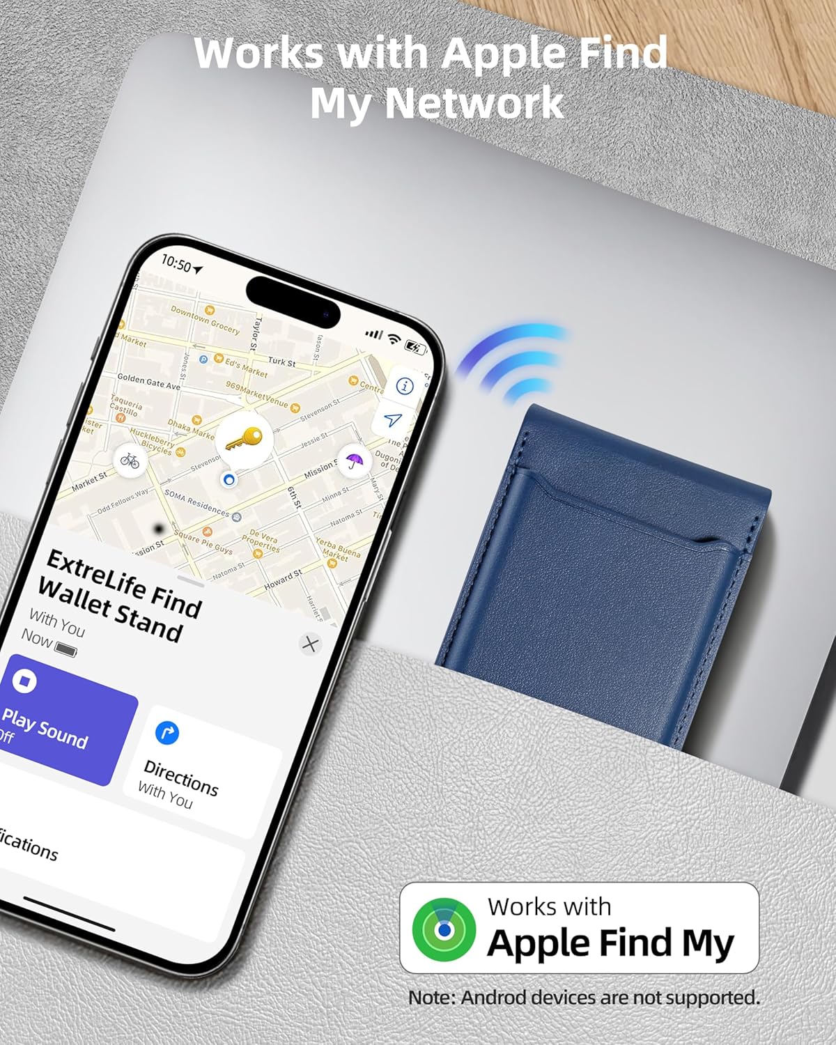 Works with apple find my app: With full Apple-Certified Find My functionality. Add this magnetic wallet to Find My App on your Apple iOS device, letting you see its real-time location. Play a sound on your phone to find it nearby with Bluetooth, or locate it through GPS with the Apple Find My Network, with the help of hundreds of Apple devices around the world. Get notified when you leave it behind and set lost mode to help you get it back. Never worry about losing your wallet. Note: Android devices are not supported.
