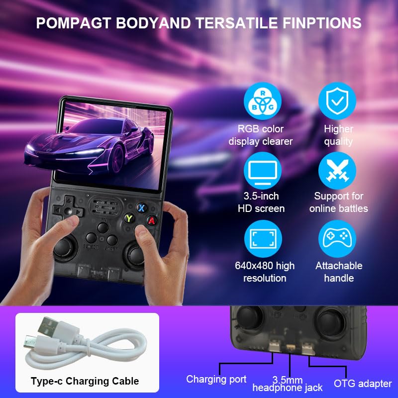 Compact: Compact in size and easy to carry: The r36s portable game console weighs around 0.4 pounds and is suitable for carrying in a pocket when going out. It is equipped with a 3200mah rechargeable polymer lithium battery, which can work for 3-5 hours after being fully charged. Please use a 5v-2a charger to charge it. The handheld game simulator does not support ultra fast charging.