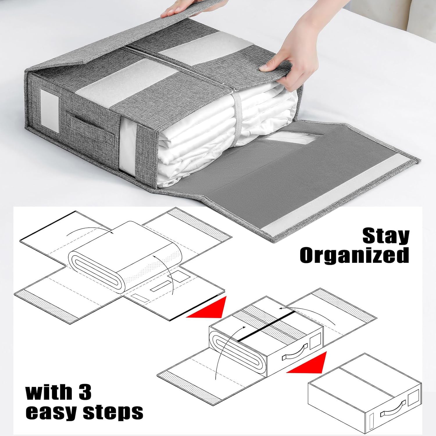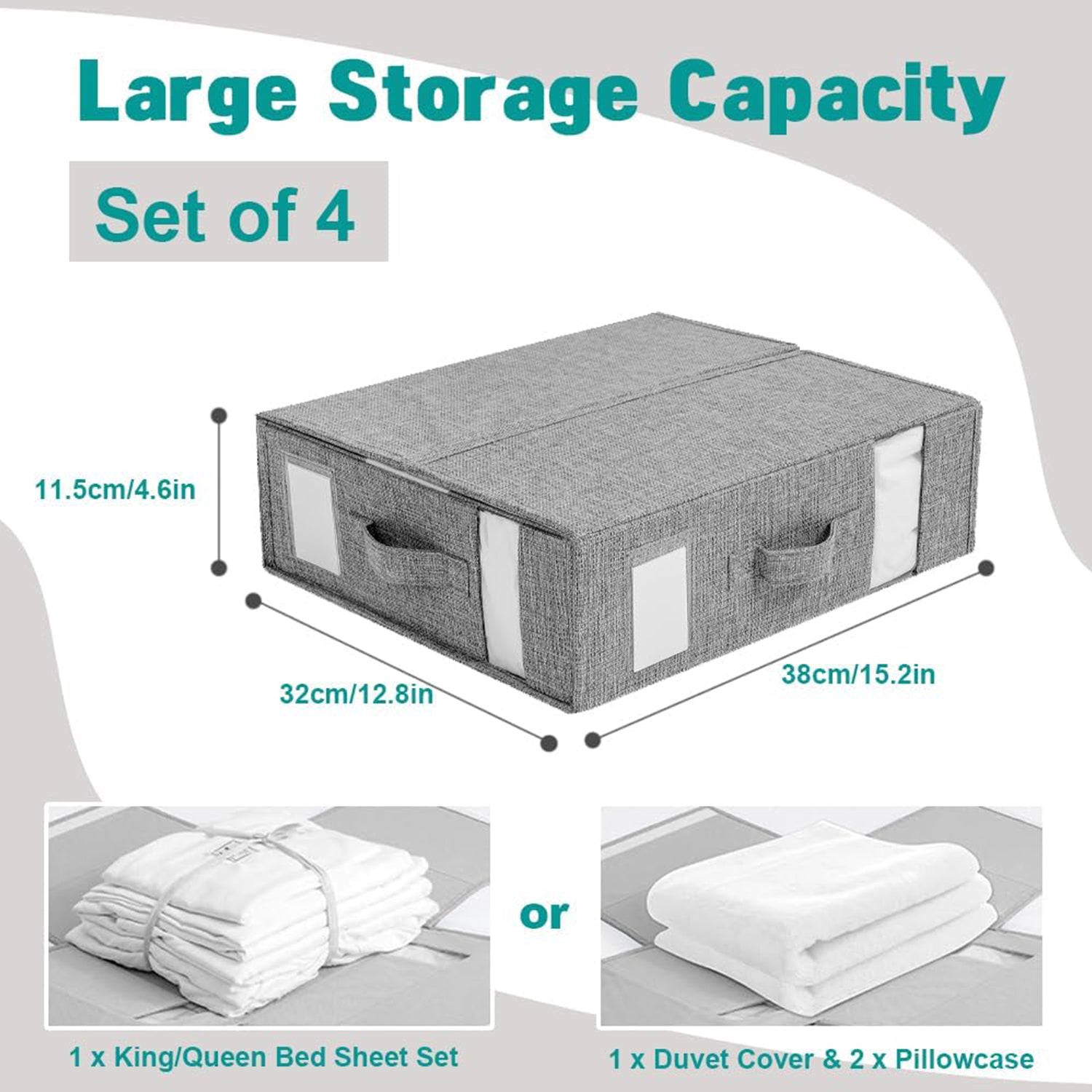 Four sets for all your needs: This versatile box can accommodate everything from a thin fleece blanket to a complete king-size bedding set (thick flannel blanket may not be suitable). with a set of four, you'll have ample space to store seasonal bedding sets and spare linens, ensuring your wardrobe stays clutter-free. plus, when not in use, they can be conveniently folded to save space and maintain organization.