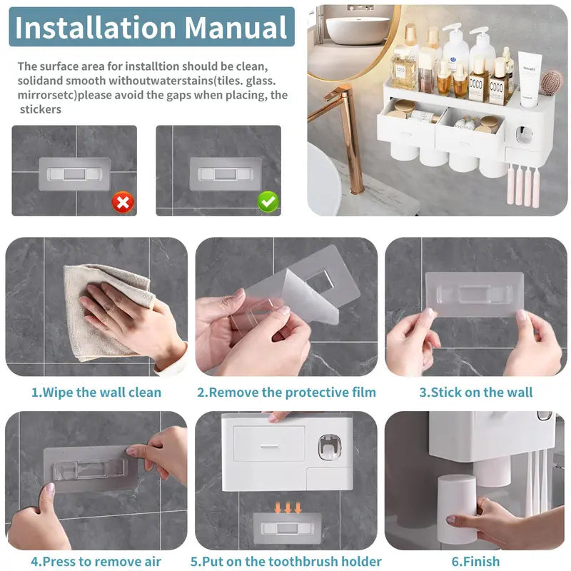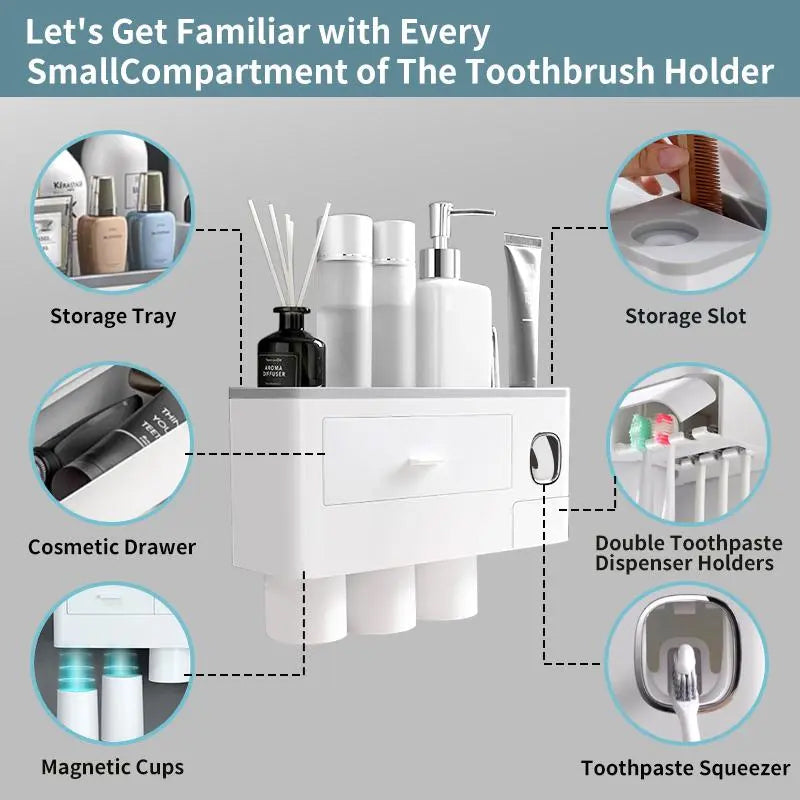 • Multifunction design: This multi-function toothbrush holder features an automatic toothpaste dispenser for effortless and waste-free dispensing. The four magnetic mouthwash cups use an upside-down draining design that is dustproof and waterproof. It can hold up to seven toothbrushes at once, making it suitable for the whole family.