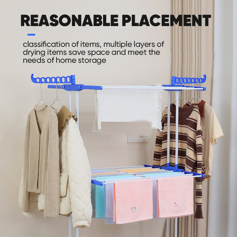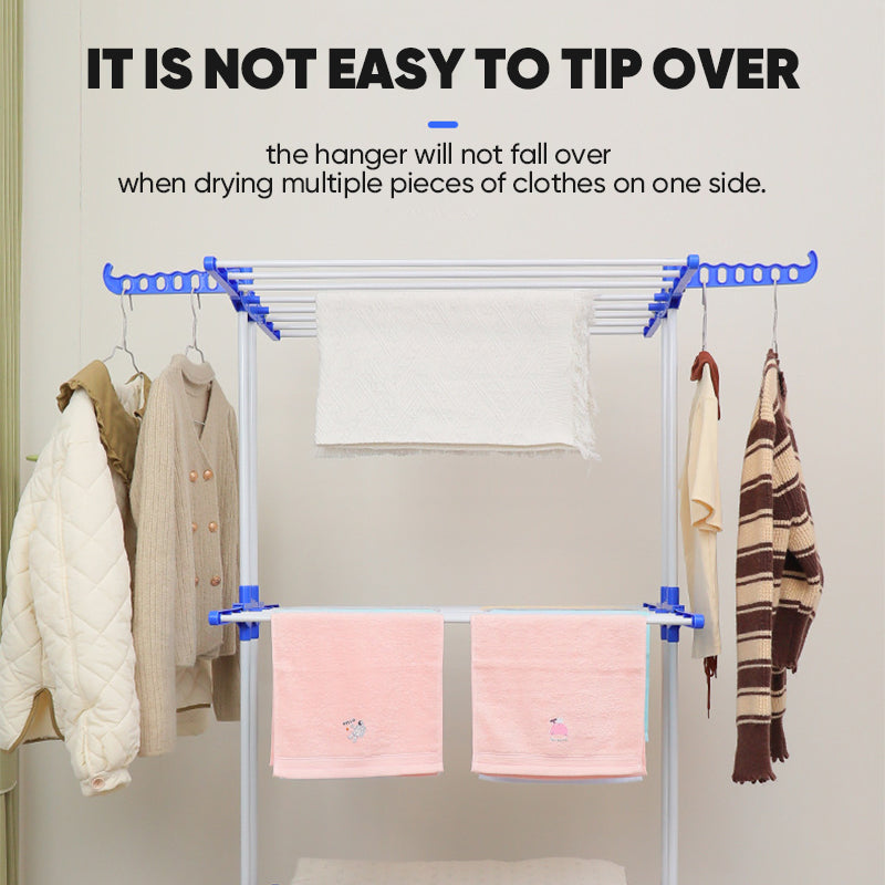 Side wings: The folding drying rack's two 360° rotating side wings have 7 windproof hook holes for hanging clothes, backpacks or umbrellas, providing plenty of space for your laundry to dry.