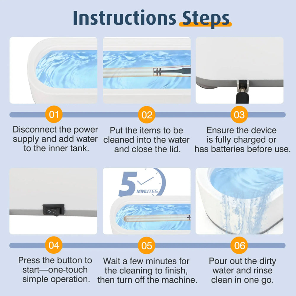 Wait a few minutes: The cleaner will automatically turn off after the 5-minute cleaning cycle is complete. Once it's done, you'll be amazed at how quickly and efficiently your items are cleaned, leaving you with more time for other tasks. This convenient automatic shut-off feature ensures energy efficiency and peace of mind.