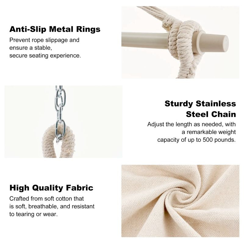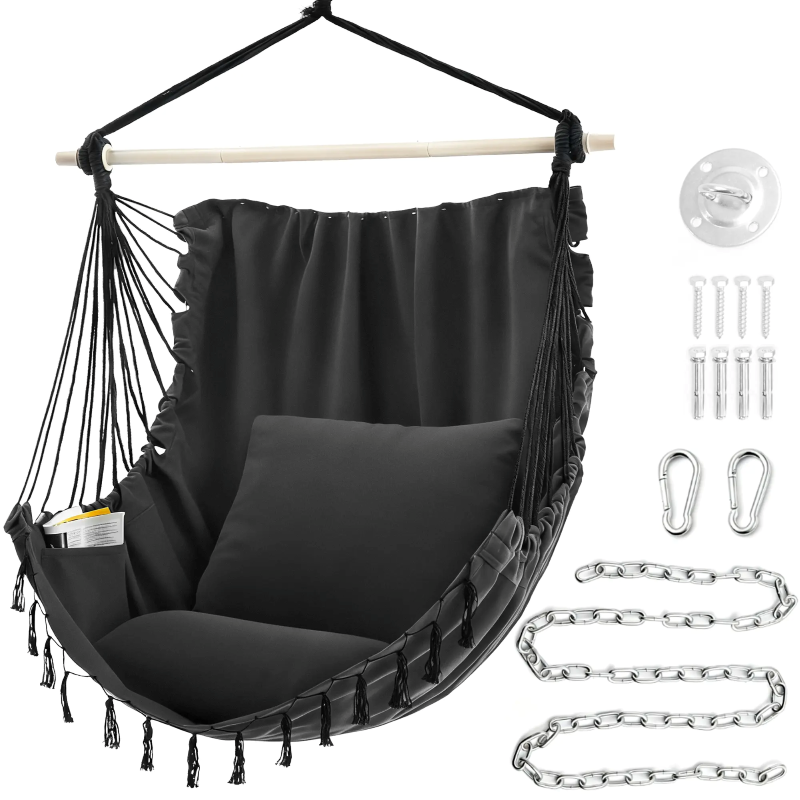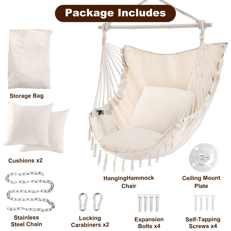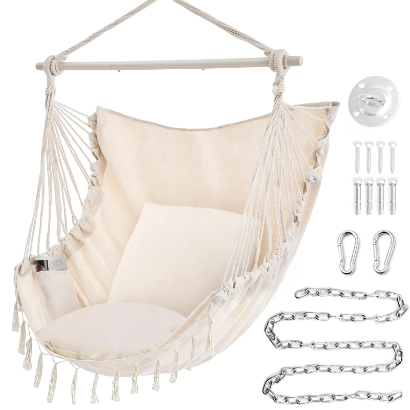 Extra: The swing hammock chair is made of high-grade poly-cotton fabric - comfortable, durable, and no strange odor. The upgraded fabric size is 59 x 47 inches. It is huge enough, unlike other small chairs, which you could only sit on. This hanging hammock chair will let you lie down and enjoy full relaxation. The cushion size is 19.7 x 19.7 inches, larger than most others’ cushions, providing better back support.