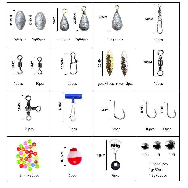 - Various fishing tackle kit: It collects nearly all accessories including fishing hooks, round split shot, egg sinker, dipsey swivel sinker, fishing float, fishing spinner blade, fishing snap, 5 kinds of different fishing swivels, fishing sinker slider, fishing beads, and bobber stops. The fishing hooks especially suitable for smaller fish such as perch, bluegill, crappie, and walleye.
