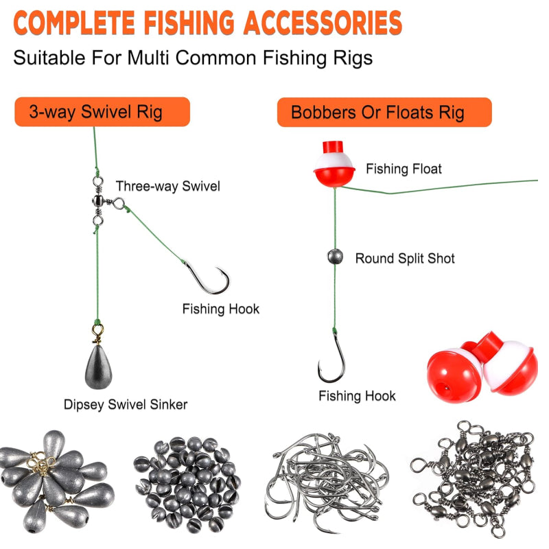 - Widely usage fishing set: Abundant accessories in the tackle box, to put together a variety of fishing rigs you want, such as fish finder rig, blinding sinker rig, and bobbers rig. Which work great for both saltwater and freshwater, perfect for all water layers! Meet all you need for different fish you catch, such as bass, bluegill, crappie, etc. This complete assortment of fishing accessories kit is suitable for any angler in any season in any water.