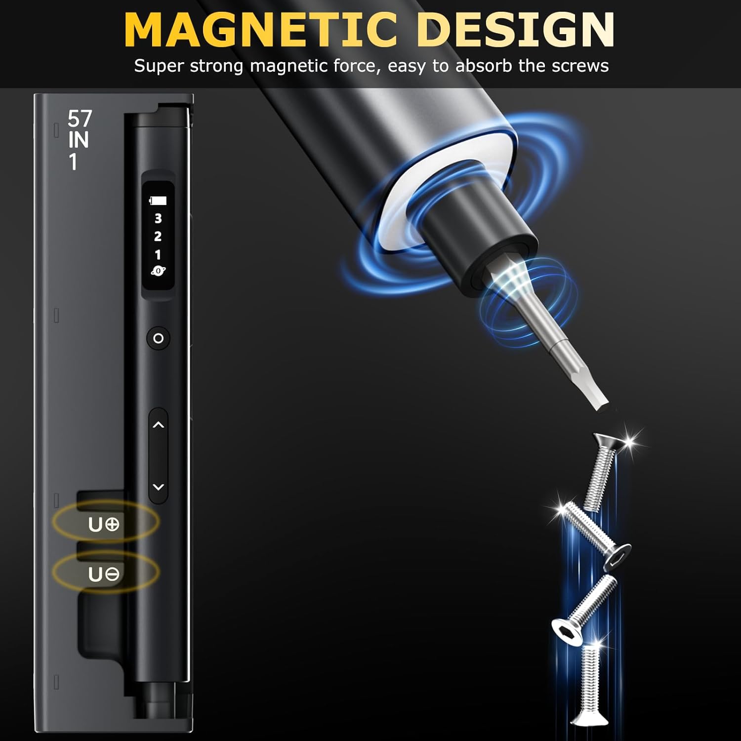 This electric screwdriver kit includes 57 precision tools and accessories, such as various sizes of screwdriver heads, tweezers, and a metal crowbar, enabling users to tackle a wide range of repair tasks. This screwdriver set is particularly useful for repairing electronic devices, watches, and cameras, allowing users to easily swap out heads as needed