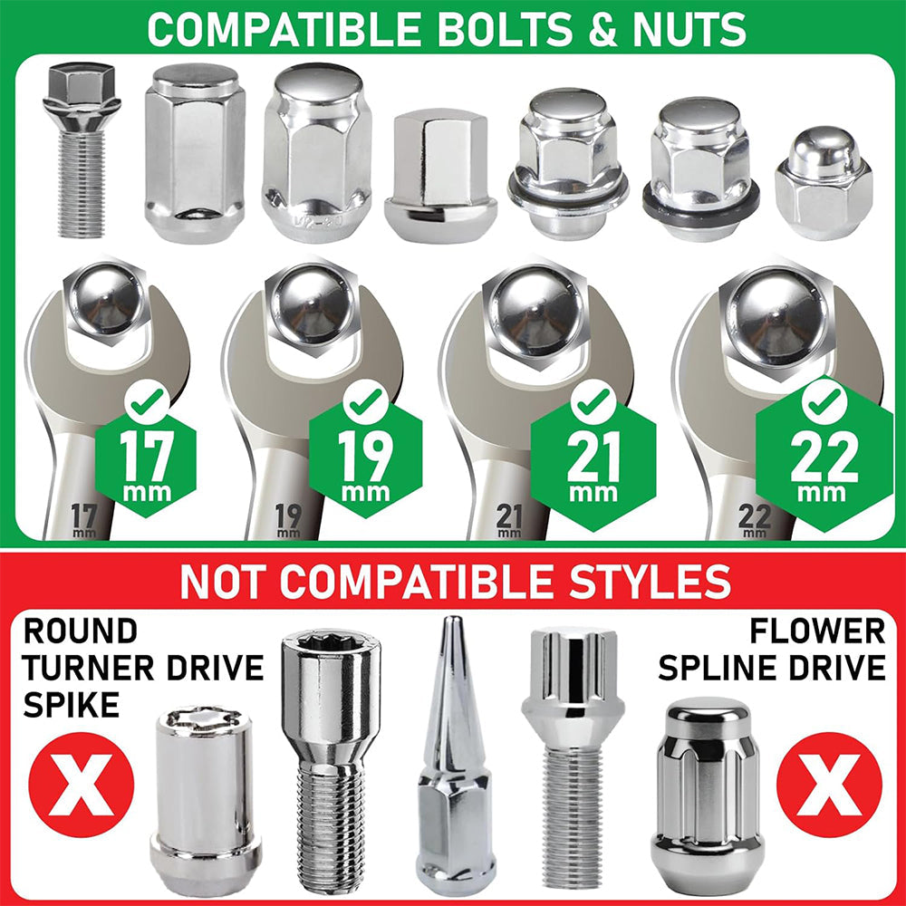 Compatible: Compatible With Conical, Spherical, Flat Seat, Mag Seat, And Open/Closed-Ended Lug Nuts/Bolts. Not For New, Deep-Recessed, Or Locking Nuts.