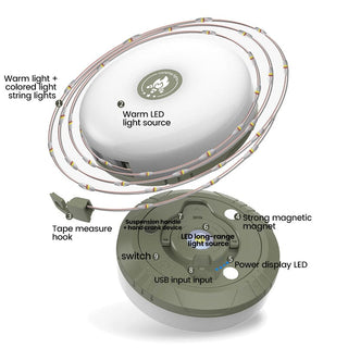 This product cleverly combines camping and ambient lighting. The hand-crank mechanism allows easy storage, and a hidden hook provides versatile hanging options. Suitable for both camping trips and home decor, it creates a variety of romantic atmospheres. The central LED provides high-brightness emergency lighting.