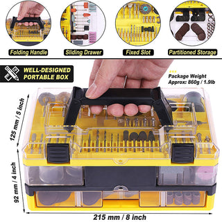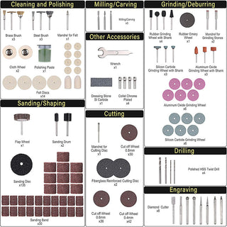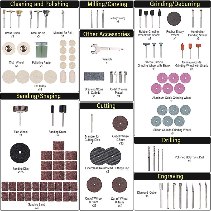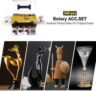 • 349 piece rotary accessory set: This complete kit includes aluminum oxide grinding wheel, nylon brush axial, sanding shank, cloth wheel, polishing drills, hss cutter cylindrical and so on.