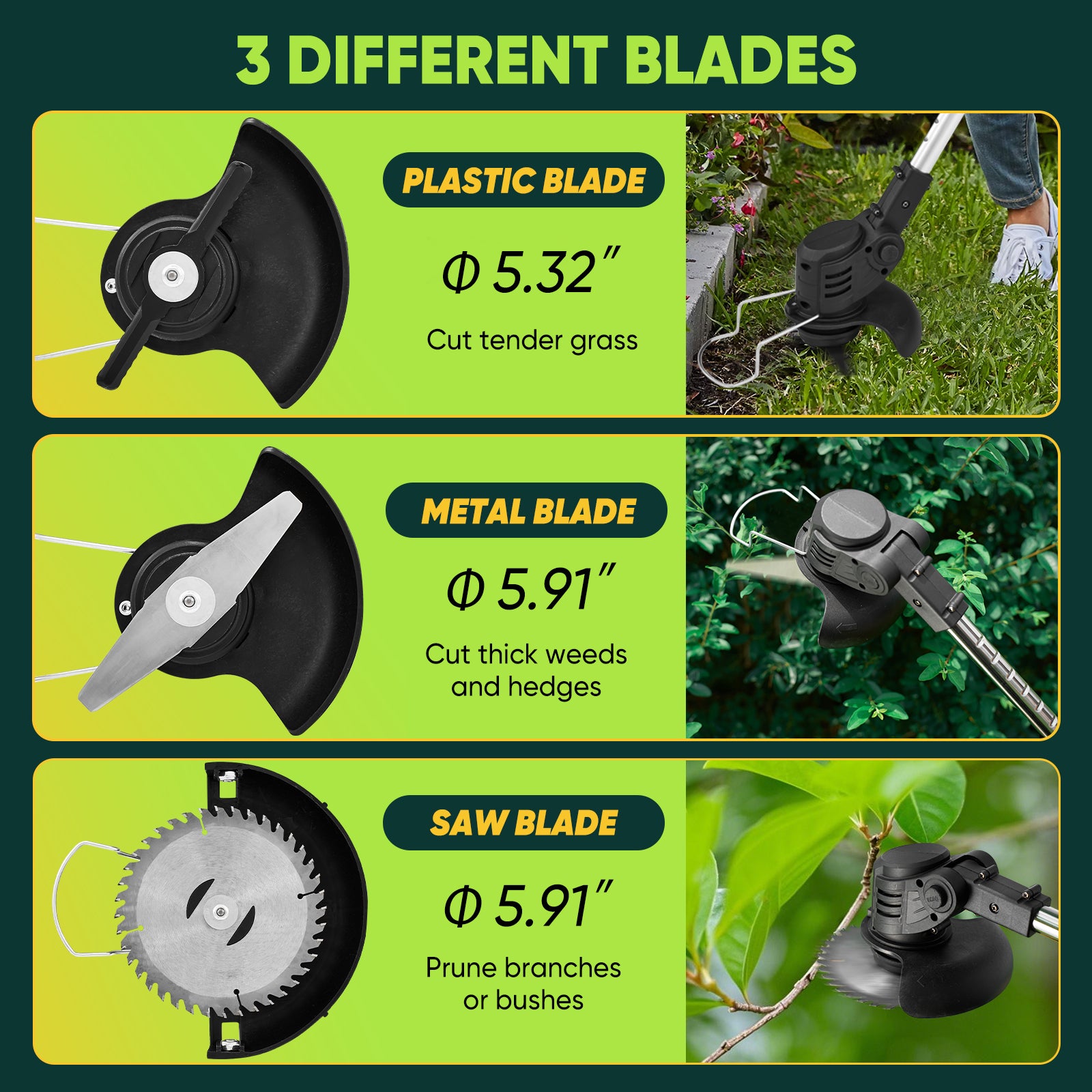 • 3 Types of Blades: The weed wacker comes with 3 types of blades: Plastic blades are suitable for cutting soft grass and other light vegetation. Stainless steel metal blades for cutting thick weeds and small bushes. Manganese steel circular saw blades for cutting thicker bushes and branches.
