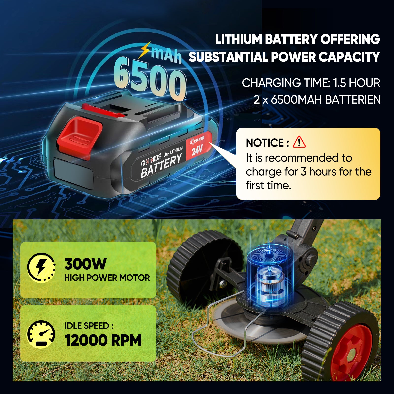 • Package Contents: The wireless lawn mower package includes a battery, 1 charger, 5 plastic blades, 2 metal cutting blades, 1 manganese steel circular saw blade, and multiple spare parts to meet your different needs.