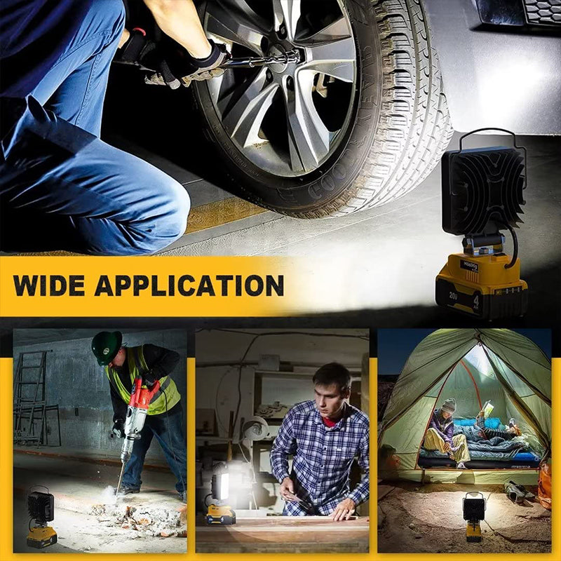 Battery powered: 20v max led work light for dewalt 18V/20V Lithium-ion Batteries DCB206 DCB205 DCB204 DCB181 DCB182 DCB200 DCB203 DCB205-2 DCB204-2 DCB206-2 and more. Easy to use even when there is no power supply outdoors, as long as you bring batteries. And you no longer need to be tethered to an outlet or struggle with tangled cords, making it easy to work in tight spaces, on job sites, or outdoors. Warm tip: this work light 20v does not include any batteries.