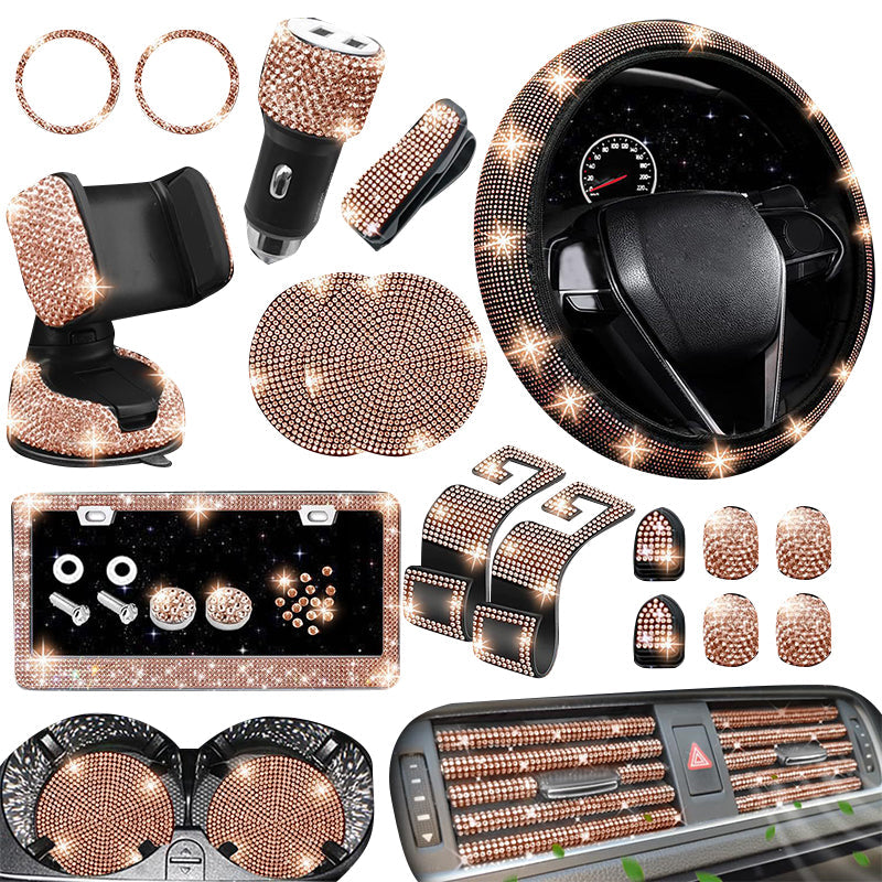Package include: The NBTEPEM bling car accessories set is value for money. You will receive: 1 pc steering wheel cover, 1 pc phone holder, 1 pc license plate frame, 10 pcs car vent outlet trim, 1 pc dual USB charger, 2 pcs car coasters, 2 pcs car seat back hooks, 1 pc glasses holder, 4 pcs valve caps, 2 pcs start button rings, and 2 pcs mini hooks.