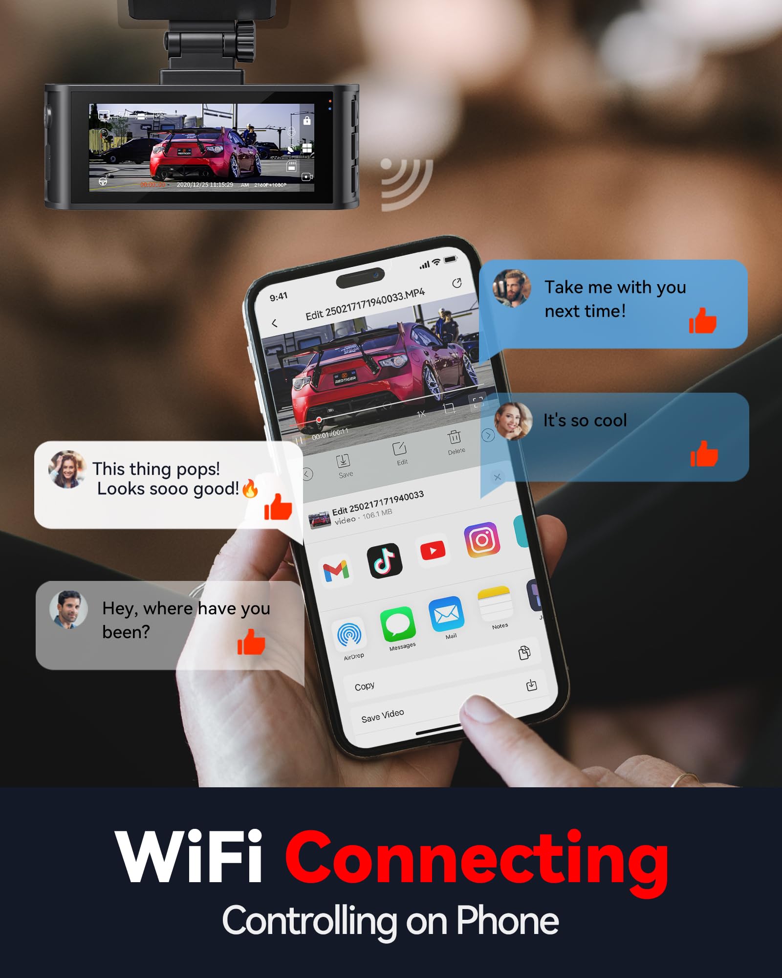 4k dual dash camera: Featuring Top Quality 4K Front Camera And 1080p Rear Cam, The Dashcam Captures More Detailed Images, Including Street Signs And License Plates. Additionally, With Wide-Angle Camera, The 4K Dash Cam Brings Extended Views And Less Blind Spots.