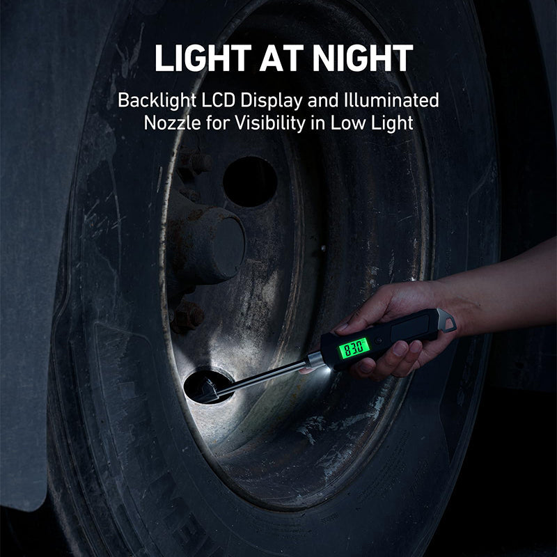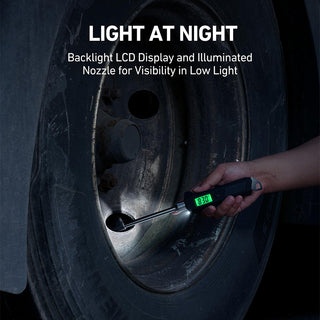 • Green backlit lcd digital tire pressure gauge: The green backlit LCD display and integrated flashlight ensure visibility in dimly lit areas. Easy-to-read digits allow for quick and accurate measurement of your vehicle's tire pressure.