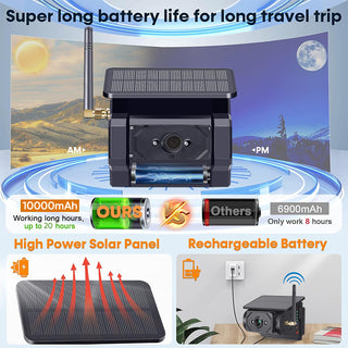 • Install-free & portable removal: The rv backup camera uses solar panel to power, the base is built-in 1s fast adsorption of super-strong neodymium magnets, completely solved the traditional camera's complex wiring and installation process, to help you save more time. The back up camera for truck.rv be easily disassembled and moved to a different location after installation, or quickly switched between multiple vehicles, and won't be dropped or demagnetized even on bumpy and rugged roads.